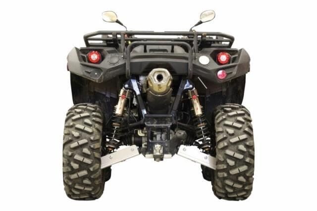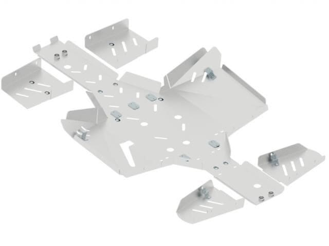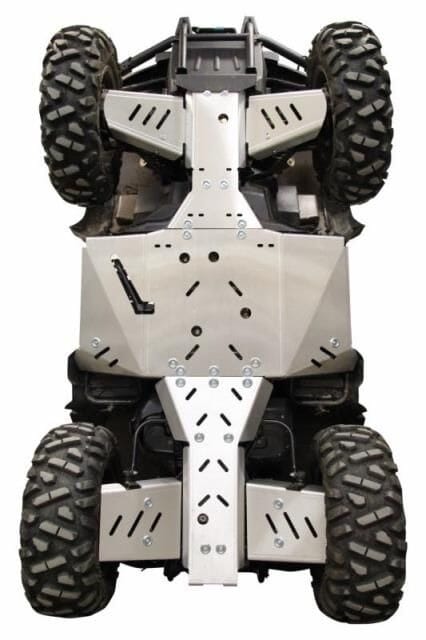 Komplett bukskjold kit i Aluminium. Beskytter hele undersiden, bærearmene, fotbrettene og nedre del av fronten. Riller og hull i skjoldet for lettere drenering av gjørme, søle og vasking. Skjoldet har også åpninger for oljeskift og vinsj og er tilpasset slik at man kan montere Iron Baltic sitt midtmontert feste for pushtube til brøyteskjær, børste og annet utstyr.