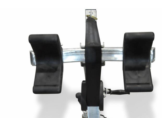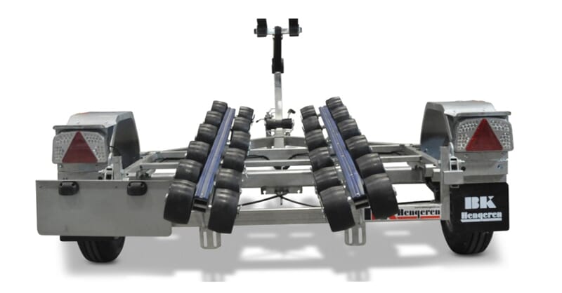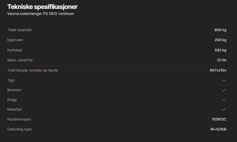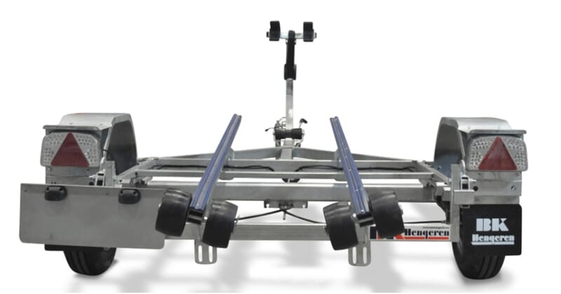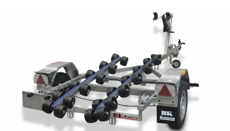 Vannscooterhenger med slisser. Denne kan påmonteres flere støttehjul slik at scooteren/båten ligger på hjul i stedet for slissene. Dobbel baugfeste for god støtte i front mot vinsj. Høytmonterte baklykter som ikke skal tas av ved ut/opptak. BILDET ER AV UBREMSET HENGER.