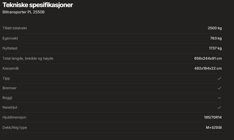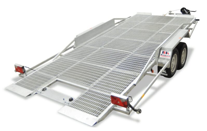 Stabil henger med lavt tyngdepunkt for sikker frakt av bil. Kan leveres med hel bunn( bilder er med hel bunn). Stålskjermer, kraftig nesehjul, vinsj med wire og hydraulisk tipp er standard. NB: Leveres med svingbare baklykter.