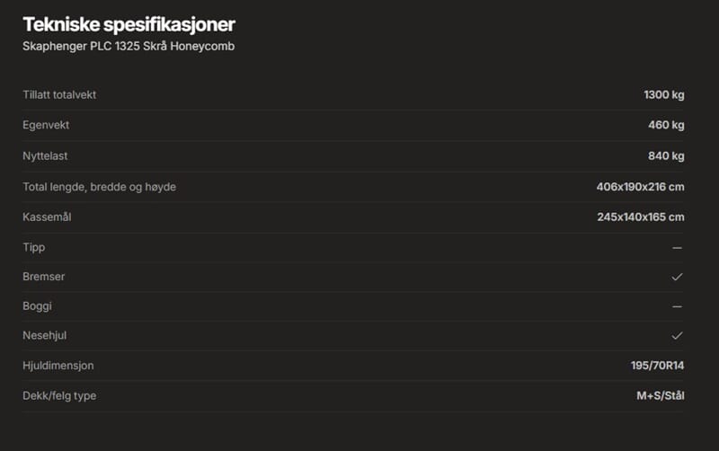 Skaphengeren leveres med honeycomb-vegger, som gir en optimal kombinasjon av lav vekt og høy styrke. Denne strukturen gir ekstra stivhet og holdbarhet, samtidig som den reduserer vekt, noe som gir bedre lastekapasitet og drivstofføkonomi. Hengeren har skrå tak som ytterligere forbedrer drivstofføkonomien. Den er også utstyrt med LED-lys for økt synlighet og sikkerhet. Sidedør kan leveres som tilleggsutstyr.