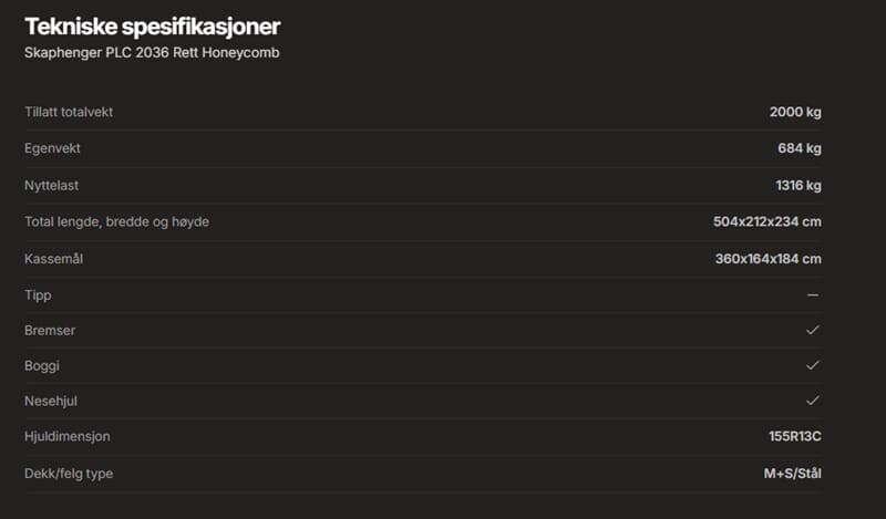 Skaphengeren leveres med honeycomb-vegger, som gir en optimal kombinasjon av lav vekt og høy styrke. Denne strukturen gir ekstra stivhet og holdbarhet, samtidig som den reduserer vekt, noe som gir bedre lastekapasitet og drivstofføkonomi. Hengeren er utstyrt med LED-lys for økt synlighet og sikkerhet. Sidedør kan leveres som tilleggsutstyr
