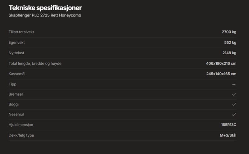 Skaphengeren leveres med honeycomb-vegger, som gir en optimal kombinasjon av lav vekt og høy styrke. Denne strukturen gir ekstra stivhet og holdbarhet, samtidig som den reduserer vekt, noe som gir bedre lastekapasitet og drivstofføkonomi. Hengeren er utstyrt med LED-lys for økt synlighet og sikkerhet. Sidedør kan leveres som tilleggsutstyr