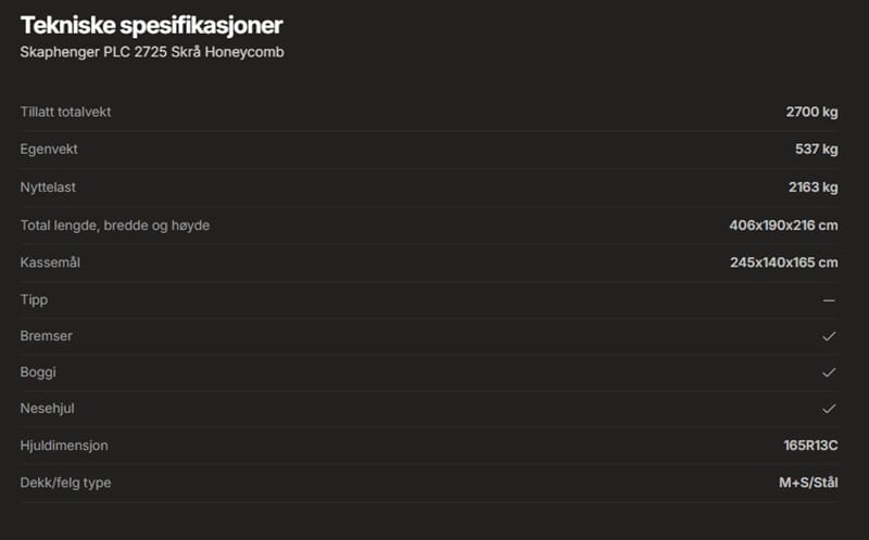 Skaphengeren leveres med honeycomb-vegger, som gir en optimal kombinasjon av lav vekt og høy styrke. Denne strukturen gir ekstra stivhet og holdbarhet, samtidig som den reduserer vekt, noe som gir bedre lastekapasitet og drivstofføkonomi. Hengeren har skrå tak som ytterligere forbedrer drivstofføkonomien. Den er også utstyrt med LED-lys for økt synlighet og sikkerhet. Sidedør kan leveres som tilleggsutstyr.