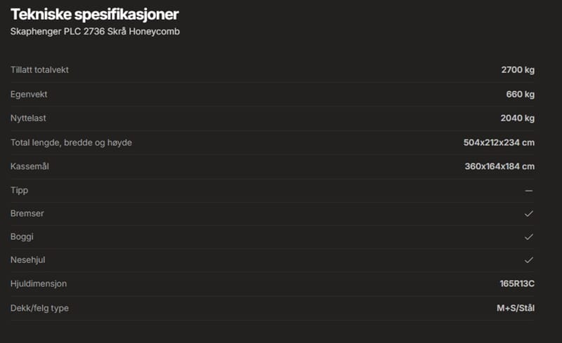 Skaphengeren leveres med honeycomb-vegger, som gir en optimal kombinasjon av lav vekt og høy styrke. Denne strukturen gir ekstra stivhet og holdbarhet, samtidig som den reduserer vekt, noe som gir bedre lastekapasitet og drivstofføkonomi. Hengeren har skrå tak som ytterligere forbedrer drivstofføkonomien. Den er også utstyrt med LED-lys for økt synlighet og sikkerhet. Sidedør kan leveres som tilleggsutstyr.