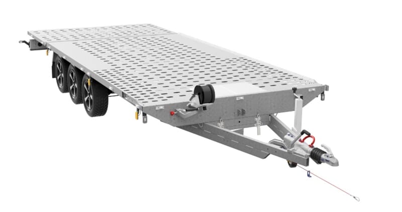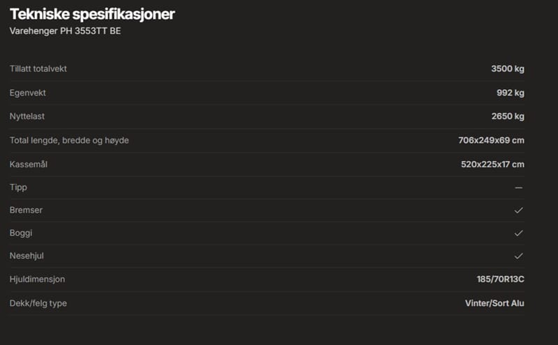 Hengeren leveres med forsterkede sidekarmer, forluke og bakluke, samt standard enveis tipp for enkel påkjøring og lossing av maskiner som snøfreser og gressklipper. Den har både utvendige og innvendige surrefester, et forsterket lyspanel og LED-lys for økt synlighet og sikkerhet. Hengeren er helsveiset og varmgalvanisert for langvarig beskyttelse mot rust. Treveistippen gjør det mulig å tilte 52° opp eller 45° til siden. Alle hengere leveres med stålskjermer.