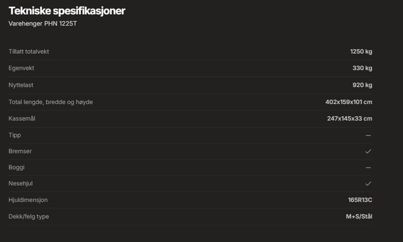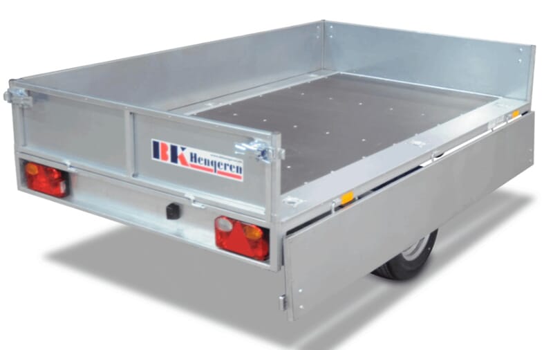Henger leveres med forsterkede, nedfellbare sidekarmer/forluke/bakluke. Hjørnestolpene kan tas av. Standard med utvendige og innvendige surrefester. Forsterket lyspanel. Helsveiset og varmgalvanisert Hengeren kan leveres med forhøyningskarmer, nettingkarmer, glassfibertopp, presenning.