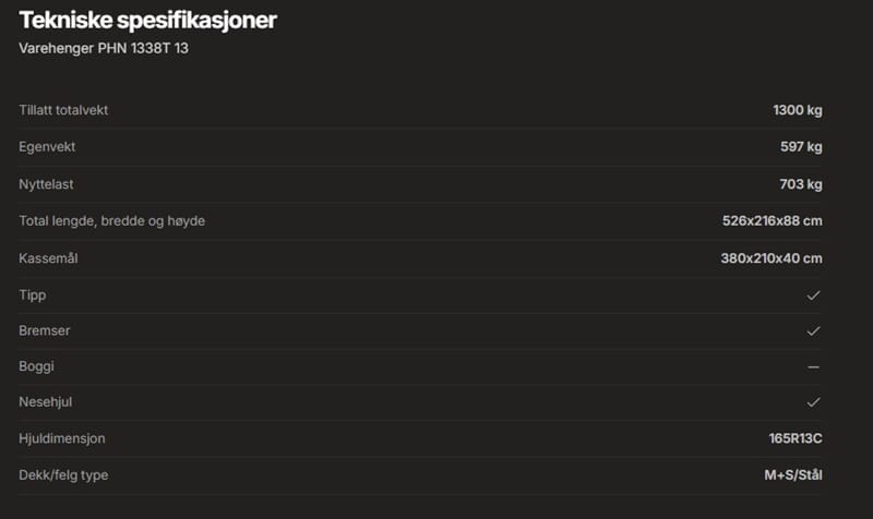 Henger leveres med forsterkede sidekarmer/forluke/bakluke. Forsterket lyspanel. Helsveiset og varmgalvanisert henger og forsterket V-drag. Hengeren kan leveres med presenning, forhøyningskarmer på 33 cm, nettingkarmer på 70 cm, glassfibertopp 120 cm.