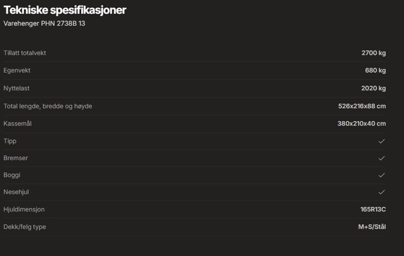 Henger leveres med forsterkede sidekarmer/forluke/bakluke. Forsterket lyspanel. Helsveiset og varmgalvanisert henger og forsterket V-drag. Hengeren kan leveres med presenning, forhøyningskarmer på 33 cm, nettingkarmer på 70 cm, glassfibertopp 120 cm.