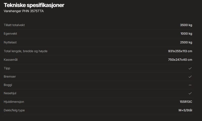 Hengeren er utstyrt med forsterkede aluminiums sidekarmer for vektreduksjon, samtidig som den beholder høy robusthet og kvalitet. Den har forluke og bakluke, samt både utvendige og innvendige surrefester. Hengeren er også utstyrt med et forsterket lyspanel for ekstra synlighet og sikkerhet. Helsveiset og varmgalvanisert for langvarig beskyttelse mot rust. Hjørnestolpene kan enkelt tas av for fleksibel bruk. Hydraulisk tipp og oppkjøringsrampe er tilgjengelig som ekstrautstyr. Alle hengere leveres med stålskjermer.