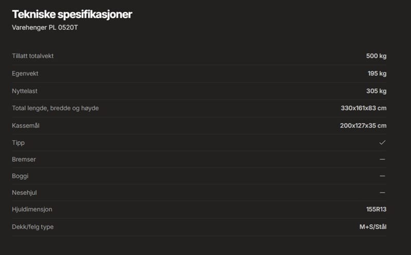 Henger leveres med forsterkede sidekarmer, forluke og bakluke. Standard m/tipp for å lette påkjøring av snøfreser/gressklipper etc. Standard med utvendige og innvendige surrefester. Forsterket lyspanel. Helsveiset og varmgalvanisert Hengeren kan leveres med skjermavstivere, forhøyningskarmer på 33 cm, nettingkarmer på 70 cm, glassfibertopp 60 cm og presenning. Vi har stålskjermer på alle våre hengere.