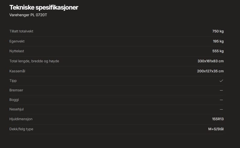 Henger leveres med forsterkede sidekarmer, forluke og bakluke. Standard med tipp for å lette påkjøring av snøfreser, gressklipper og andre hageredskaper. Standard med utvendige og innvendige surrefester. Forsterket lyspanel. Helsveiset og varmgalvanisert Hengeren kan leveres med skjermavstivere, forhøyningskarmer på 33 cm, nettingkarmer på 70 cm, glassfibertopp 60 cm og presenning. Vi har stålskjermer på alle våre hengere.