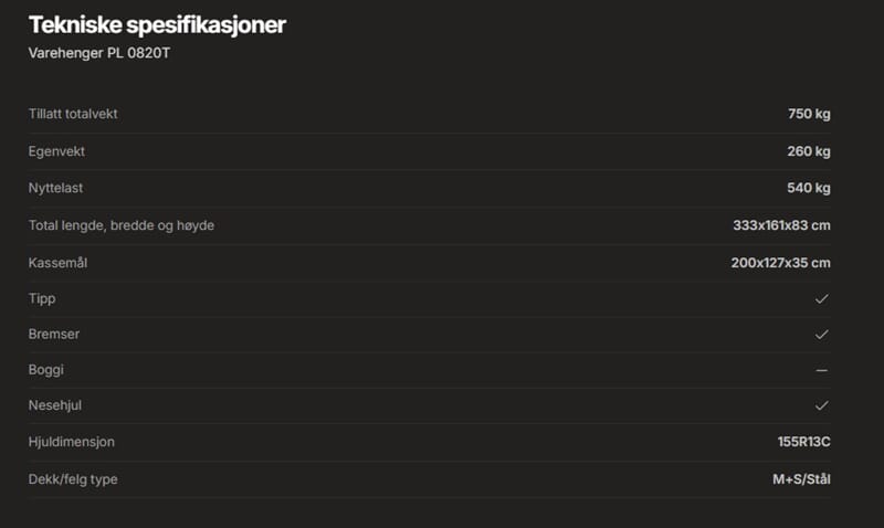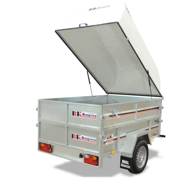 Henger leveres med forsterkede sidekarmer/forluke/bakluke. Standard m/tipp for å lette påkjøring av snøfreser/gressklipper etc. Standard med utvendige og innvendige surrefester. Forsterket lyspanel. Helsveiset og varmgalvanisert Hengeren kan leveres med skjermavstivere, forhøyningskarmer på 33 cm, nettingkarmer på 70 cm, glassfibertopp 60 cm og presenning. Vi har stålskjermer på alle våre hengere.