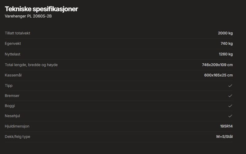 Hengeren er lang og smal, ideell for transport av scooter med pulk eller ATV med ATV-henger bak, slik at man slipper å koble dem fra hverandre før transport. Den er utstyrt med forsterkede sidekarmer, forluke og bakluke, samt standard tipp for enkel påkjøring. Hengeren har både utvendige og innvendige surrefester, samt et forsterket lyspanel for ekstra synlighet og sikkerhet. Den er helsveiset og varmgalvanisert for langvarig beskyttelse mot rust. Hydraulisk tipp kan leveres som ekstrautstyr.