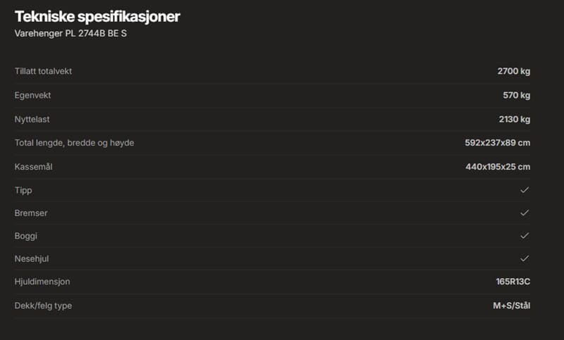 Hengeren leveres som Black Edition med stålfelg og M+S hjul som standard. Den kommer med forsterkede sidekarmer, forluke og bakluke, samt både utvendige og innvendige surrefester. Hengeren er også utstyrt med et forsterket lyspanel og LED-lys for økt synlighet og sikkerhet. Den er helsveiset og varmgalvanisert for langvarig beskyttelse mot rust. Hengeren har tipp for enkel lossing og påkjøring av maskiner som snøfreser og gressklipper. Tilleggsutstyr som forhøyningskarmer, nettingkarmer, glassfibertopp og presenning er tilgjengelig. Alle hengere leveres med stålskjermer.