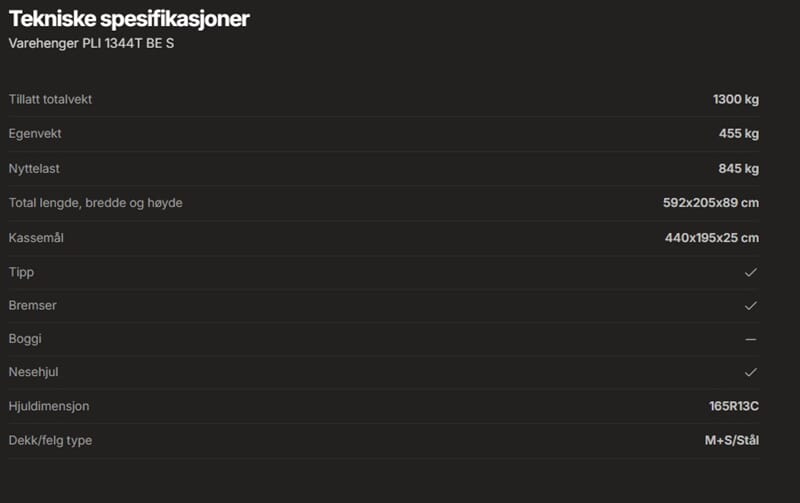 Hengeren leveres som Black Edition med stålfelg og M+S hjul som standard. Den kommer med forsterkede sidekarmer, forluke og bakluke, samt både utvendige og innvendige surrefester. Hengeren er også utstyrt med et forsterket lyspanel og LED-lys for økt synlighet og sikkerhet. Den er helsveiset og varmgalvanisert for langvarig beskyttelse mot rust. Hengeren har tipp for enkel lossing og påkjøring av maskiner som snøfreser og gressklipper. Tilleggsutstyr som forhøyningskarmer, nettingkarmer, glassfibertopp og presenning er tilgjengelig. Alle hengere leveres med stålskjermer.