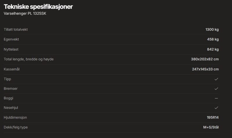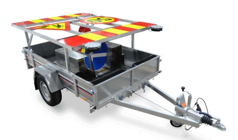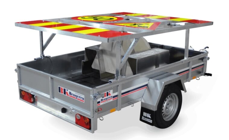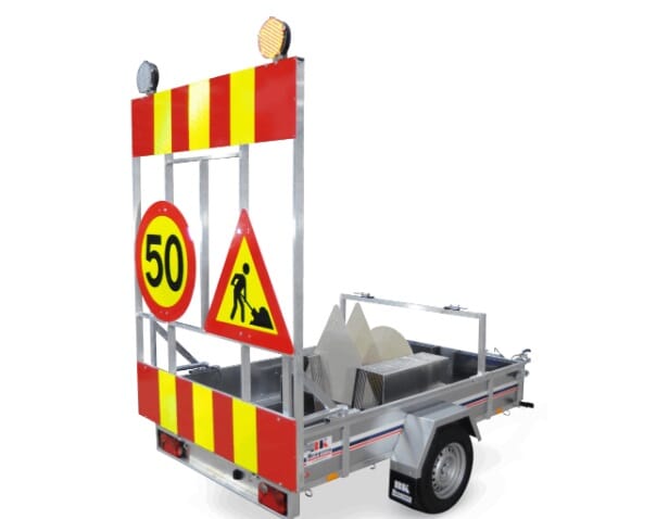 Varslingshenger med nedfellbart stativ for enklere frakt av henger. Lett å sette opp. Støttebein bak er standard. Når stativet er nede er det god plass til skilt og annet utstyr en vil ha med. Ekstra stativ for oppbevaring av flere typer skilt er ekstrautstyr. Veiarbeids skilt (110), 2 stk sperreskilt (908) to varslingslamper, og 105Ah batteri med 4 amp lader er standard.