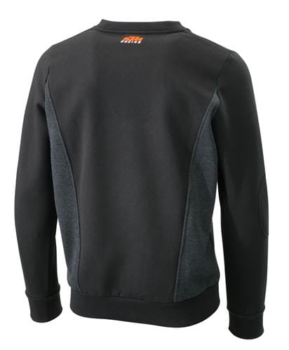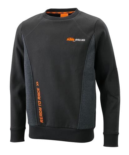 Sporty sweater in an easy-care, tough cotton mix fabric. Stylish fit, side panels in grey cappuccino fabric, reinforced elbows. Printed READY TO RACE logo and embroidered KTM Racing logo on the front, printed logo in the neck. High washability and color fastness.