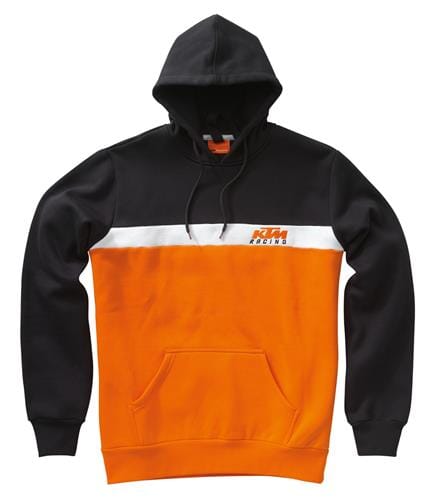 Hooded sweatshirt in KTM Racing style. Irritation of the hood falling forwards is now a thing of the past, thanks to fastening option on the back. Embroidered KTM Racing on the chest, large embroidered logo on the back, kangaroo pouch pocket.