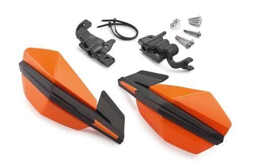 Thanks to splitting of the surfaces, these open, very light KTM MX handguards ensure an uncompromising racing look in the angular KTM design. In two-component injection moulding technology: