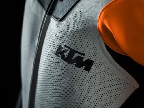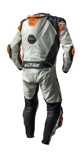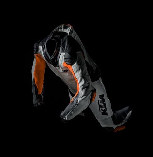 • Perforated leather racing suit with aerodynamic hump and customizing options